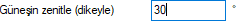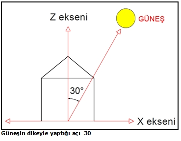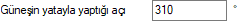 Güneşin yatayla yaptığı açı ![]() Güneşin plandaki konumunu belirleyen açıdır. X – Y koordinat düzlemindeki açı mantığında tanımlama yapılır. 0 derece ile 360° arasında değer girilebilir. ![]() |