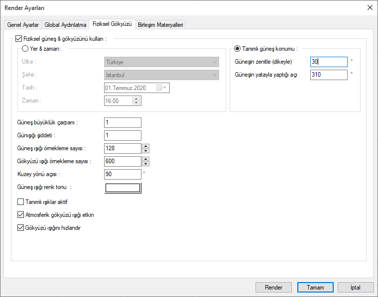 Yer & zaman ![]() Güneşin konumunu belirleyerek veya seçile ülke, şehir, tarih ve zamana göre gün ışığını kullanarak render almaya yarar. Güneşin konumuna ve saate göre gökyüzünün rengi de otomatik olarak değişecektir. Dış mekanlarda render alırken fiziksel gökyüzü (güneş ışığı) yeterli olmaktadır. Ayrıca ışık kaynağı tanımlamaya gerek kalmaz. Fiziksel güneş & gökyüzü kullan kutucuğu kapatılarak güneş aydınlanması iptal edilebilir. |