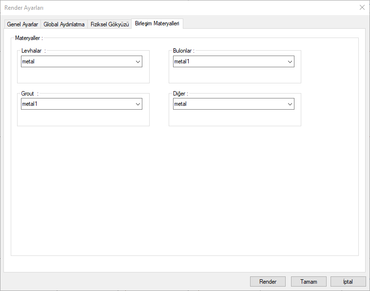 Diğer ![]() Birleşimlerde yer alan levha, bulon ve grout dışındaki diğer elemanların materyalini tıklayarak listeden seçebilirsiniz. |