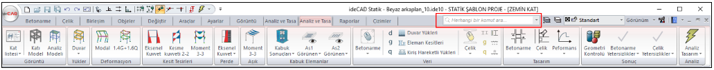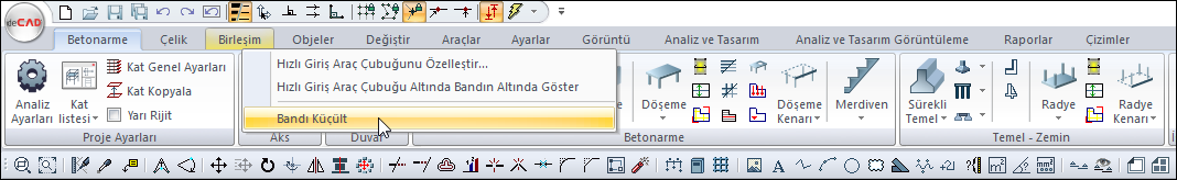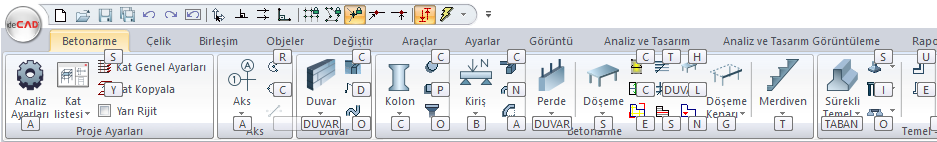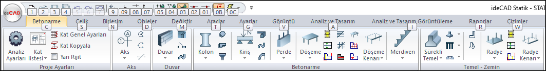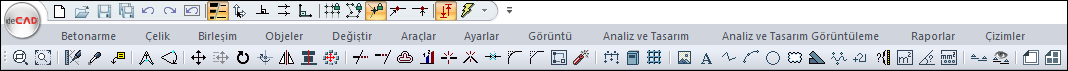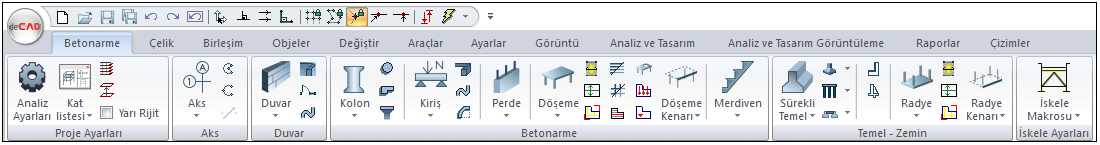 Ribbon menüde sırasıyla menü başlıkları bulunmaktadır. Betonarme, Çelik, Birleşim vb. herhangi bir menü başlığına bir kez tıklandığında o menüye geçiş yapılır, menü altında bulunan bölüm ve komut ikonlar görünür.