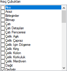 | Araç çubukları  Mevcut araç çubukları listelenir. |
