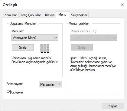 | Kısayollar  Klavye kısayollarını özelleştirmek için klavye özelleştir diyaloğunu açar. |