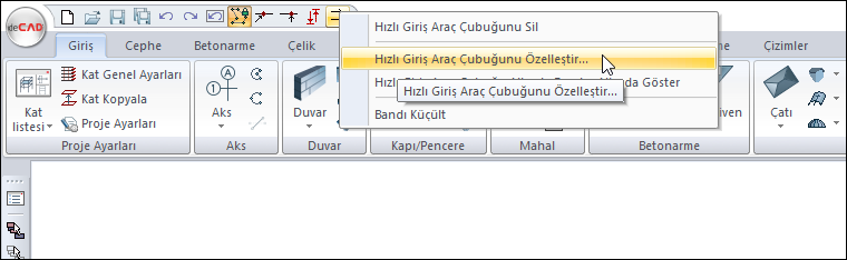 Hızlı giriş araç çubuğu ya da ribbon menüde herhangi bir komut üzerinde farenin sağ tuşuna tıklayarak ulaşabilirsiniz.