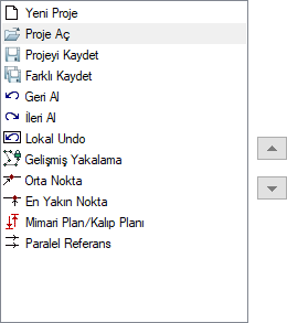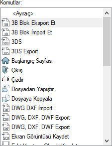 | Araç çubuğu komutları  Araç çubuğunda yer alan komutlar listelenir. Seçilen komutun yeri ok tuşları ile değiştirilebilir. |