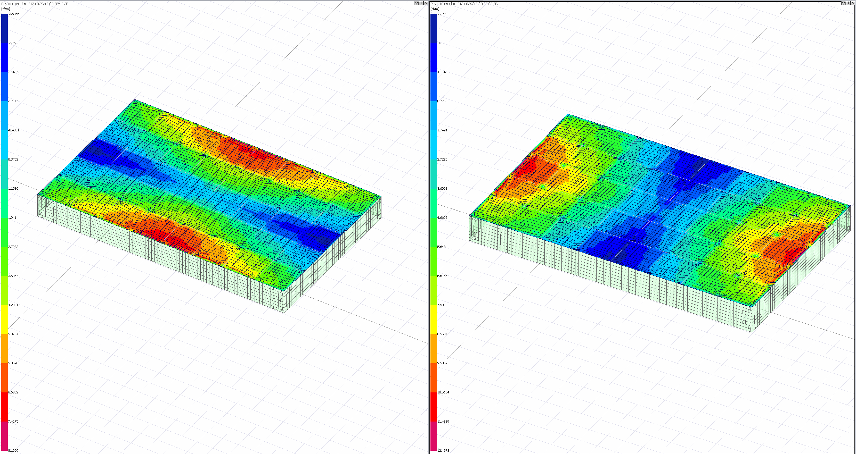 Burada döşemeler yarı rijit diyafram kabulü ile çözülmüş ve döşemeler iki boyutlu sonlu elemanlar ile modellenmiştir.( X ) ve ( Y ) yönündeki deprem etkileri sebebiyle rijit çevre perdelerine bağlanan döşemelerdeki gerilmelerin dağılımı aşağıda gösterilmiştir. Görüldüğü gibi rijit çevre perdelerin yakınlarında bulunan döşemeler daha yüksek kayma gerilmeleri almıştır. TBDY Madde 7.11.5 kullanılarak hesaplanan Döşemeden perdeye veya perde koluna kuvvetli doğrultuda aktarılacak deprem kuvveti hesabı ve TBDY Madde 7.11.3 kullanılarak hesaplanan Döşeme Gerilme Kontrolleri hesabı ile geçiş katları dahil olmak üzere tüm döşemeler kontrol edilir ve raporlanır.