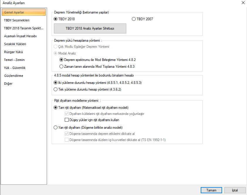 A2 ve A3 tipi düzensizlik mevcut değil ise döşemeler tam rijit diyafram olarak modellenebilir. Analiz ayarlarında Tam Rijit, Yarı Rijit ve Esnek Diyafram seçimi isteğe göre yapılabilinir.