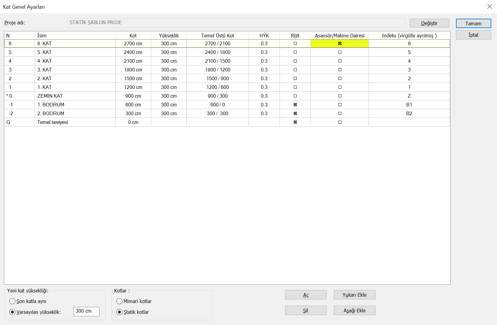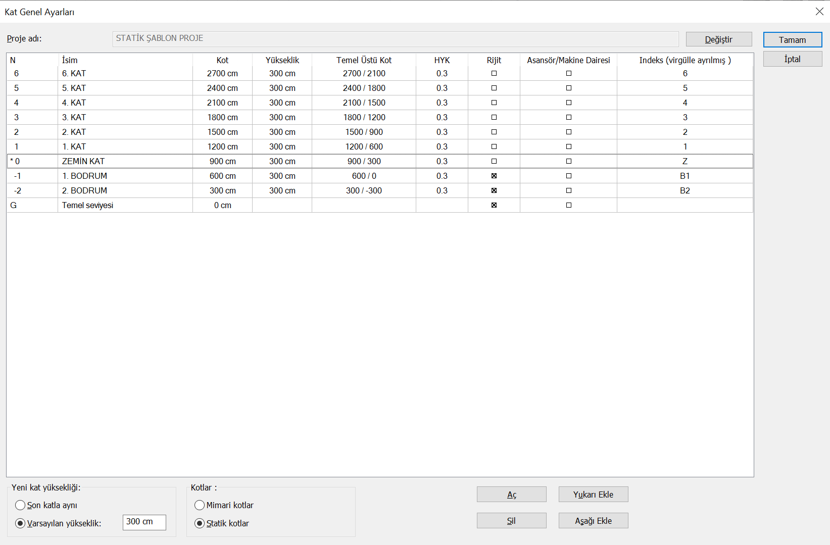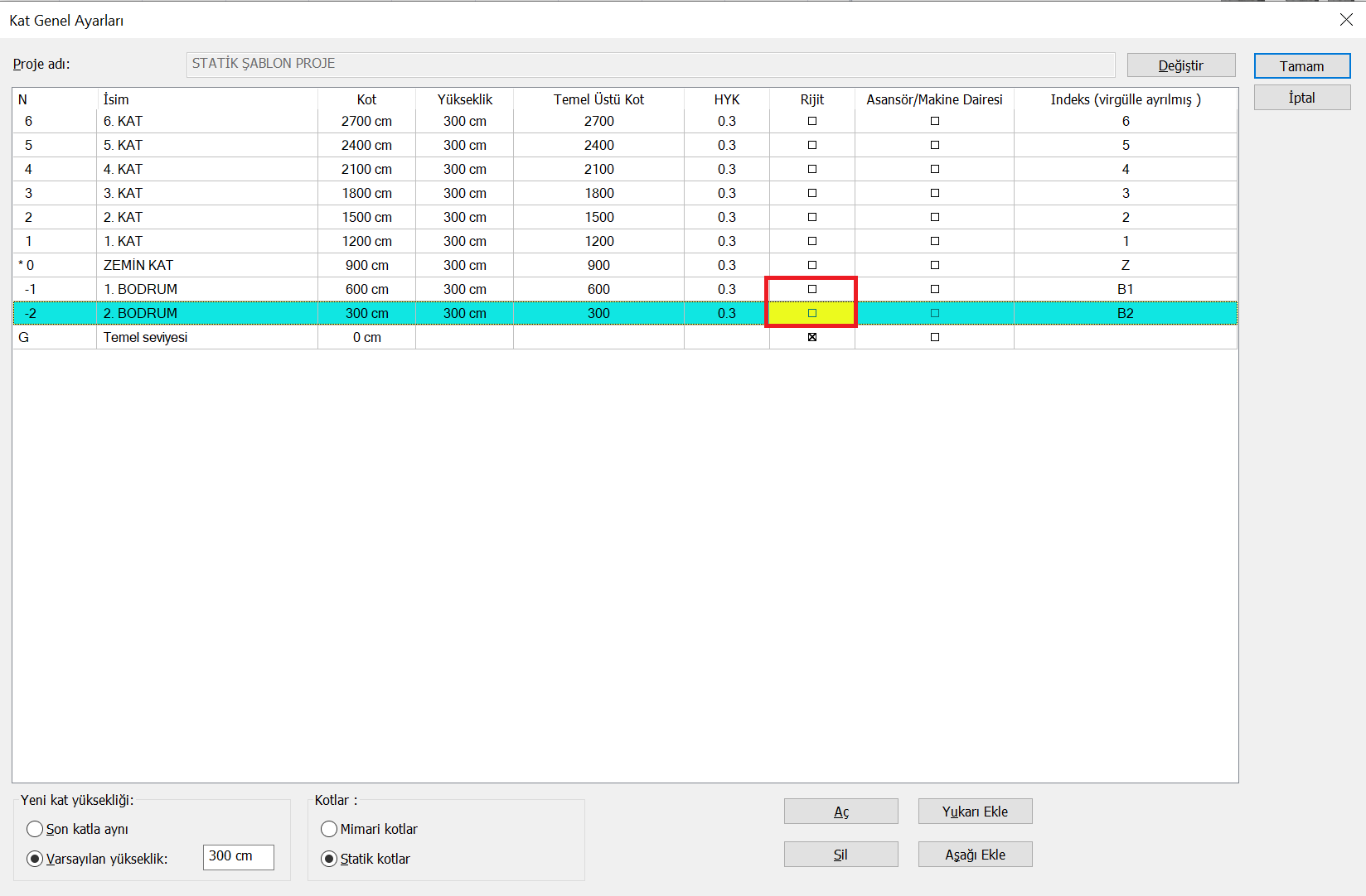 TBDY Madde 3.3.1.1(a) ve (b) koşullarının ikisi birden sağlanıyor ise rijit bodrum kabulü yapılır ve bina yüksekliği HN bodrum perdelerinin üst kotundaki kat döşemesi seviyesinden itibaren tanımlanır. Bu durumda Kat Genel Ayarları penceresinden “Rijit” işaretlenmelidir.