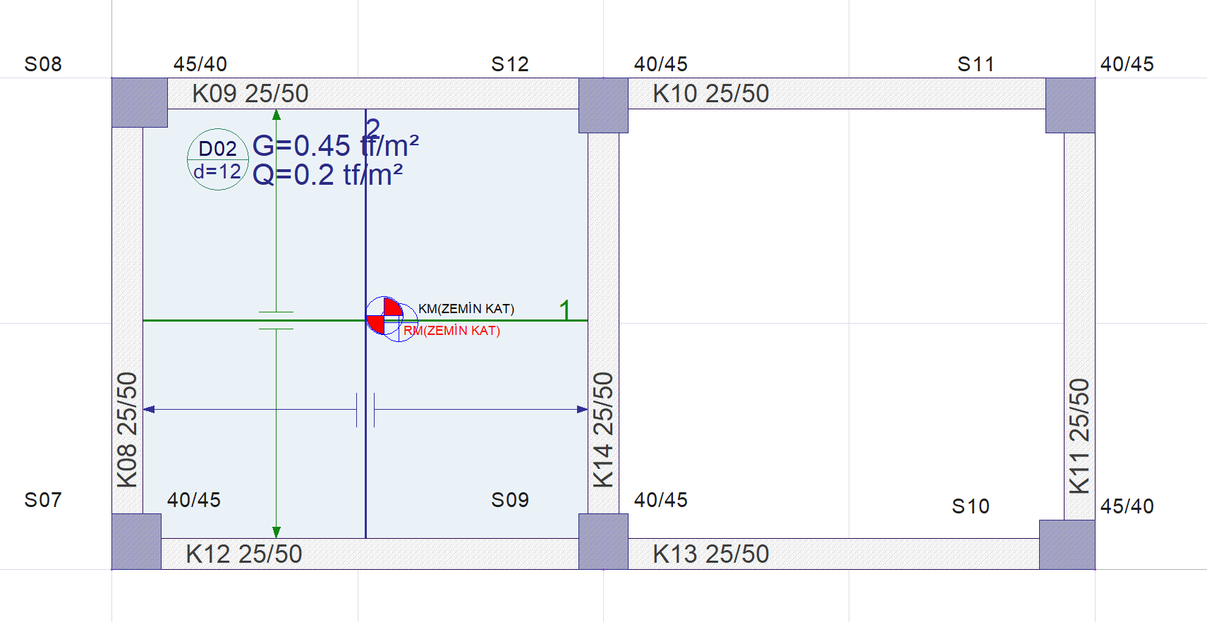 Plan düzlemi aşağıdaki gibi verilen bir betonarme sistem için kolon kiriş ve döşeme birleşim bölgelerinde tanımlanacak olan rijit bölgeler analiz modelinde gözönüne alınmaktadır. Rijit bölgelerin uzunlukları boyutlarına göre otomatik belirlenmektedir.
