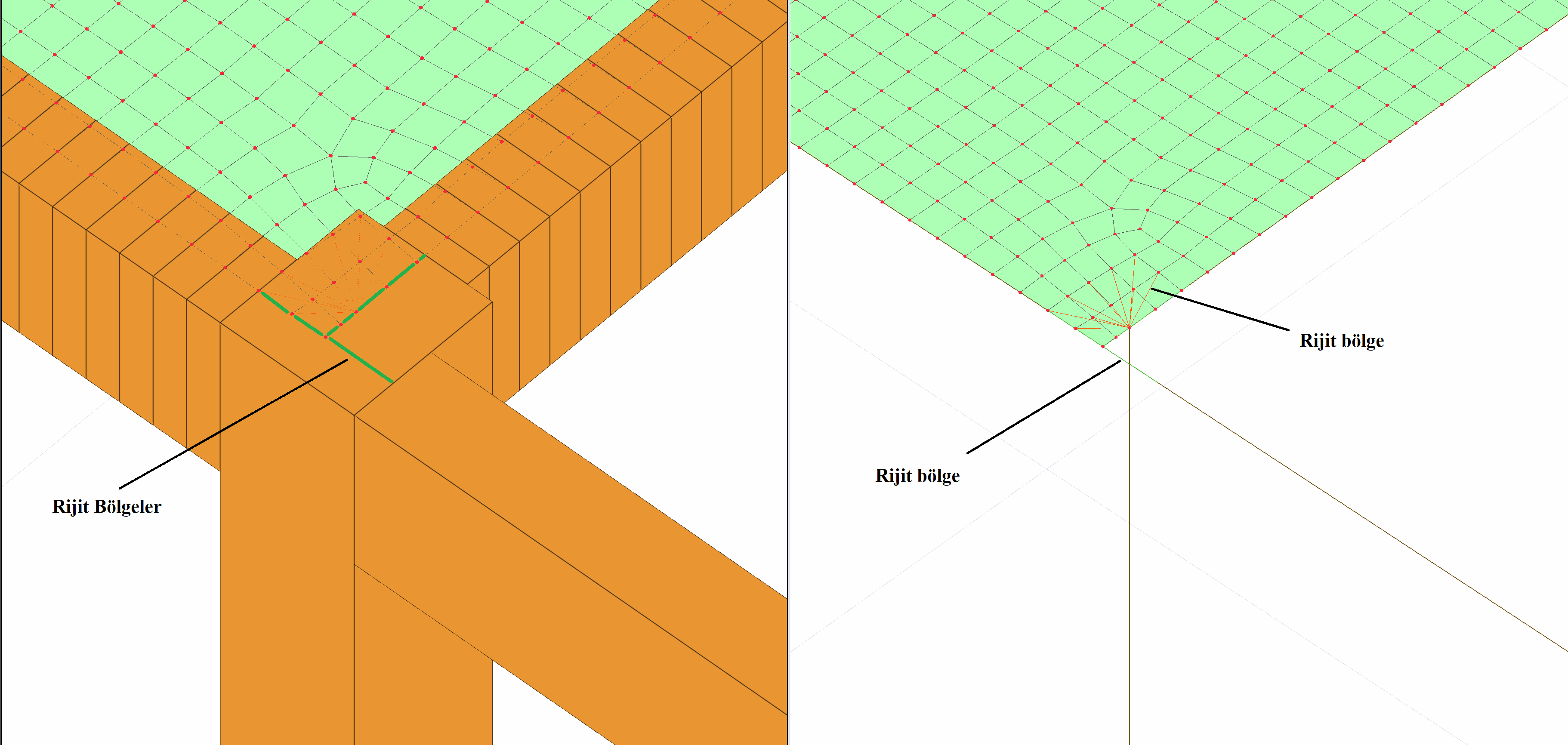 Resimde yeşil ile belirtilen bölgeler kolon-kiriş birleşimi sebebi ile tanımlanan rijit elemanlardır ve analiz modelinde görülebilir. Kırmızı bölgeler is döşeme-kolon-kiriş birleşim bölgesi sebebi ile tanımlanan rijit bölgelerdir. Döşemenin tanımlanmadığı yani kabuk sonlu eleman olmadığı durumda ise analiz modeli aşağıdaki gibi tanımlanmaktadır.