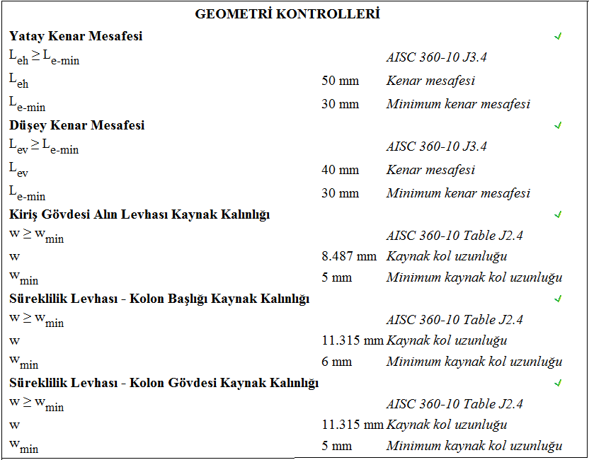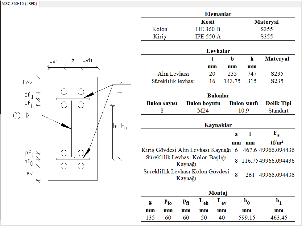Rijitleştirilmemiş Alın Levhalı Dört Bulonlu birleşim tasarımı Çelik Yapıların Tasarım, Hesap ve Yapım Esasları (ÇYTHYEDY), AISC 360-16, AISC 358-16 ve TBDY yönetmeliklerine göre otomatik yapılır ve birleşim raporu oluşturulur.