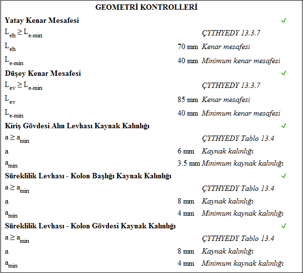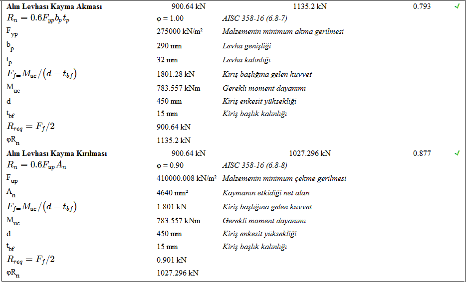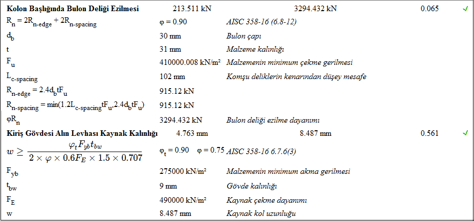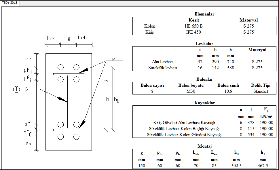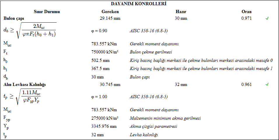 Rijitleştirilmemiş Alın Levhalı Dört Bulonlu birleşim tasarımı Çelik Yapıların Tasarım, Hesap ve Yapım Esasları (ÇYTHYEDY), AISC 360-16, AISC 358-16 ve TBDY yönetmeliklerine göre otomatik yapılır ve birleşim raporu oluşturulur.