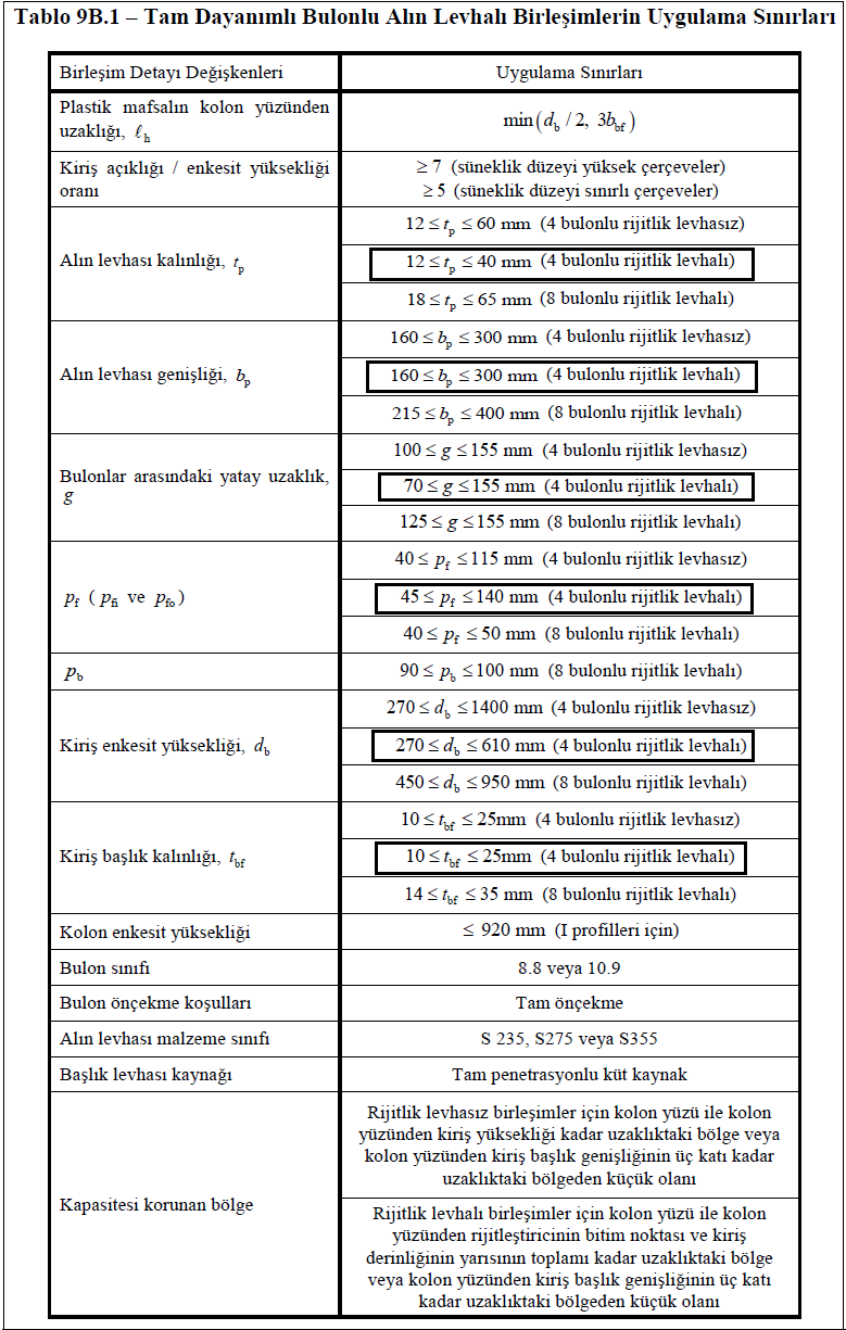 Rijitleştirilmiş Alın Levhalı Dört Bulonlu Birleşimler için sağlanması gereken koşullar TBDY EK 9B 'de belirtildiği şekilde kontrol edilir.
