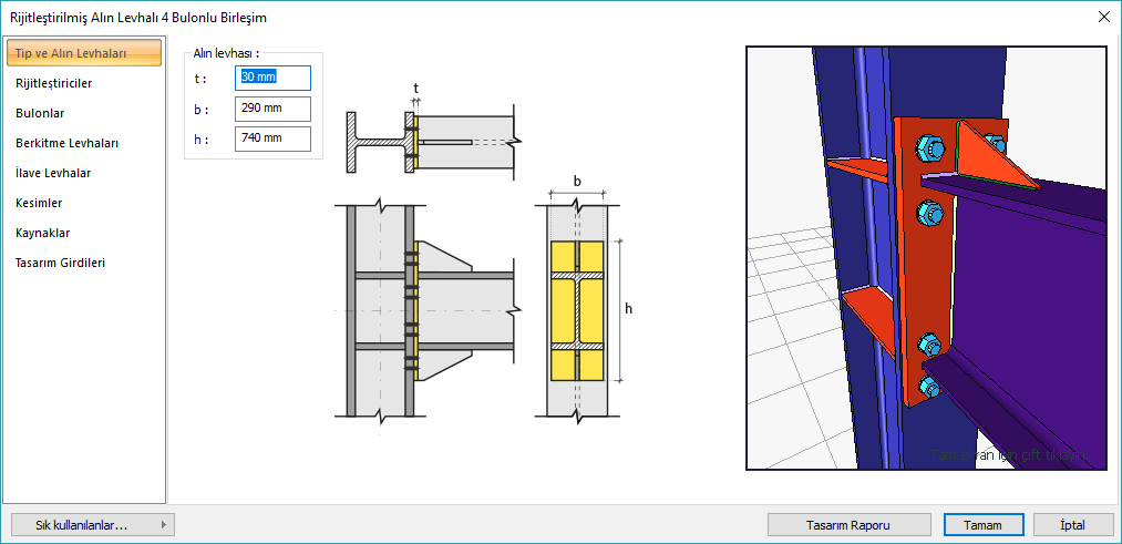 Rijitleştirilmiş Alın Levhalı 4 Bulonlu Birleşim Ayarları Diyaloğunun Yeri