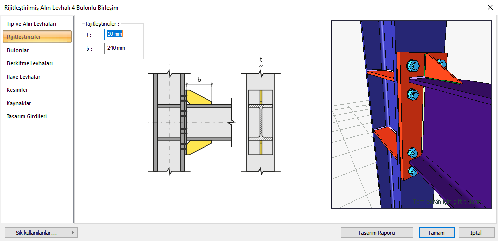 Rijitleştirilmiş Alın Levhalı 4 Bulonlu Birleşim Ayarları Diyaloğu