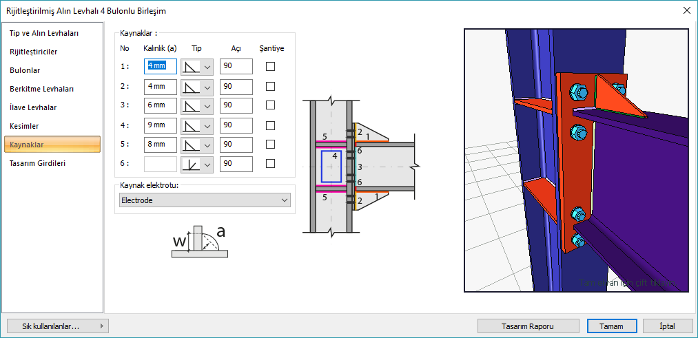 Kaynaklar ![]() Birleşim yerlerine yapılacak kaynakların kalınlık, tip ve açı değerleri verilir. Şantiyede yapılıp yapılmayacağı bilgisi girilir. |