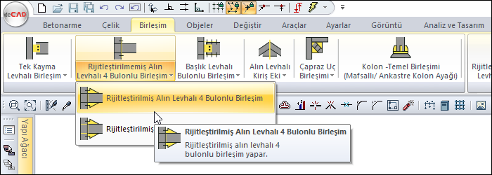 Çelik menüsünden Rijitleştirilmemiş Alın Levhalı 4 Bulonlu Birleşim satırını tıklayın.