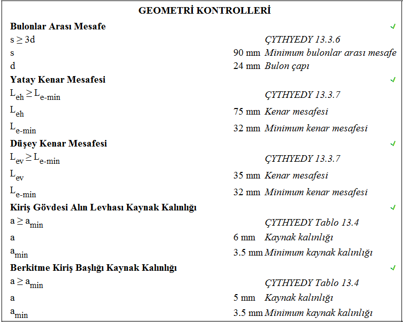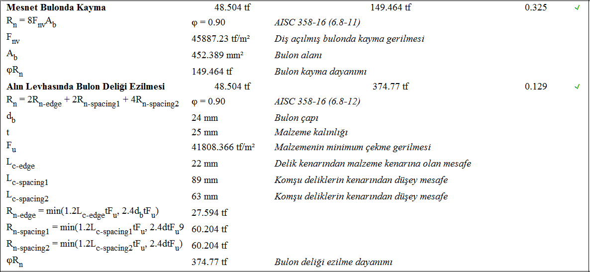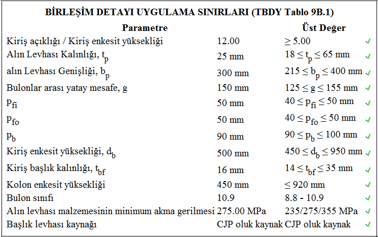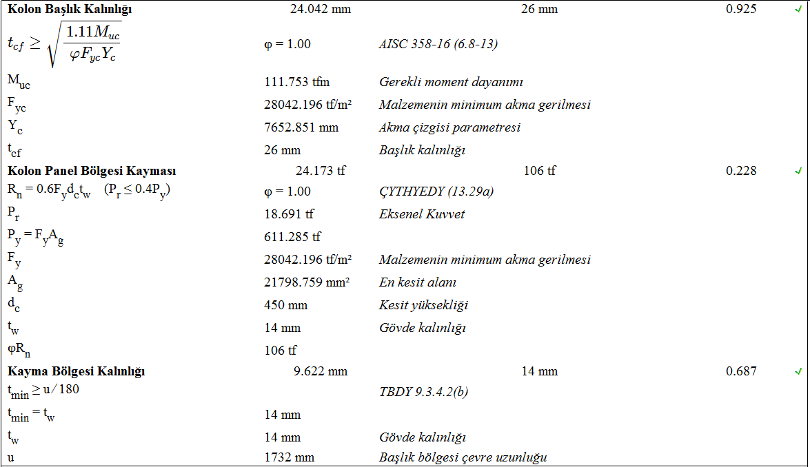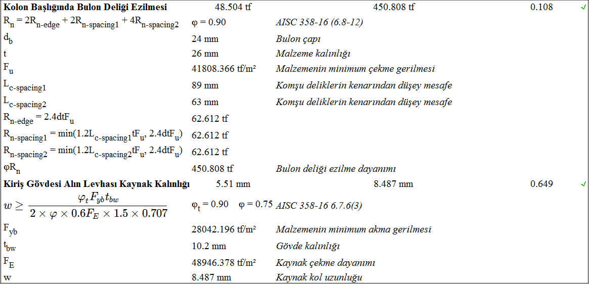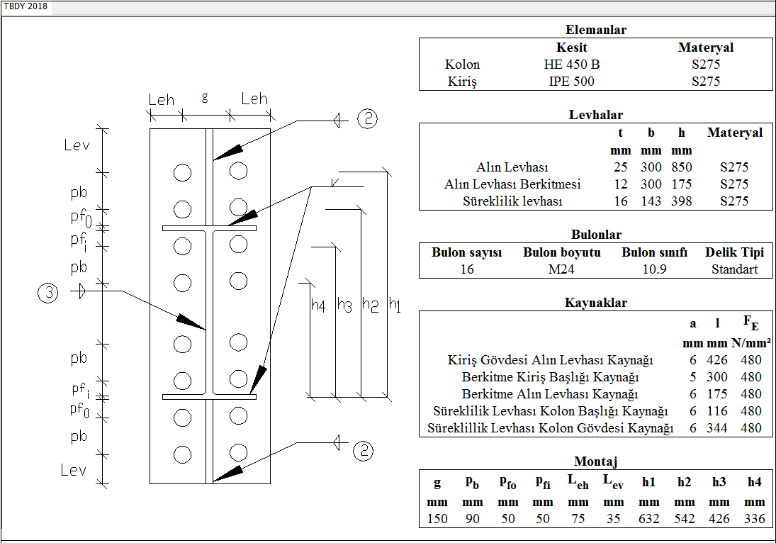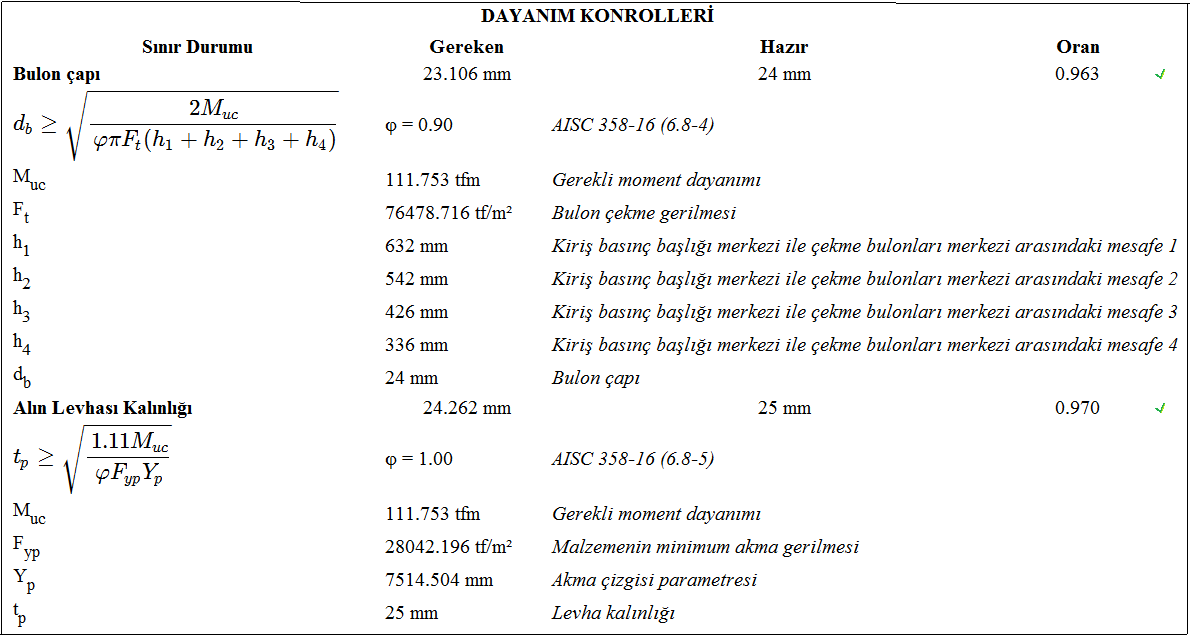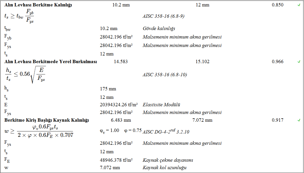 Rijitleştirilmiş Alın Levhalı Sekiz Bulonlu birleşim tasarımı Çelik Yapıların Tasarım, Hesap ve Yapım Esasları (ÇYTHYEDY), AISC 360-16, AISC 358-16 ve TBDY yönetmeliklerine göre otomatik yapılır ve birleşim raporu oluşturulur.