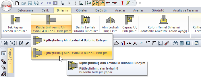 Çelik menüsünden Rijitleştirilmiş Alın Levhalı 8 Bulonlu Birleşim satırını tıklayın.