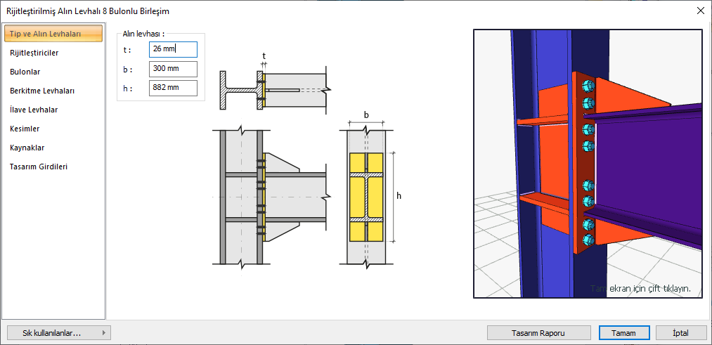 Rijitleştirilmiş alın levhalı 8 bulonlu birleşim ayarları diyaloğu açılacaktır.