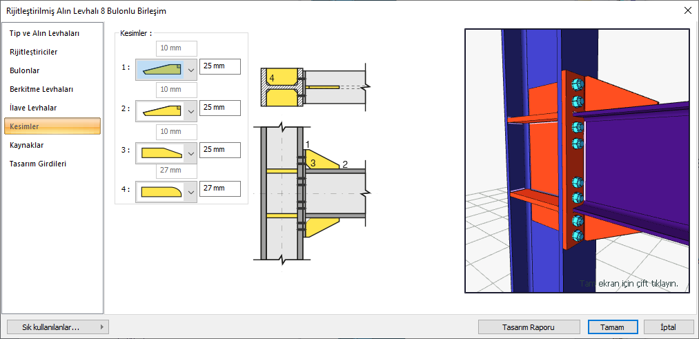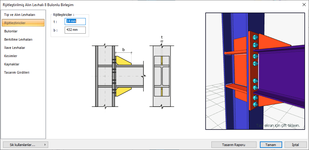 Rijitleştirilmiş Alın Levhalı 8 Bulonlu Birleşim Ayarları Diyaloğu