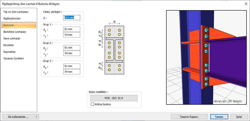 Grup 3 ![]() Bulonları kirişe ve diğer bulonlara uzaklık değerleri girilir. Girilecek değerler şematik çizimde gösterilmektedir. |