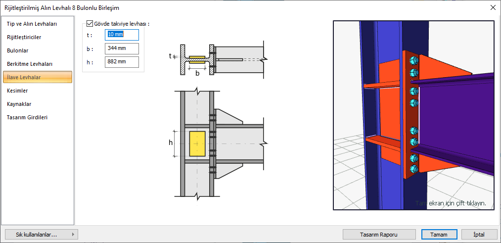 Rijitleştirilmiş Alın Levhalı 8 Bulonlu Birleşim Ayarları Diyaloğunun Yeri
