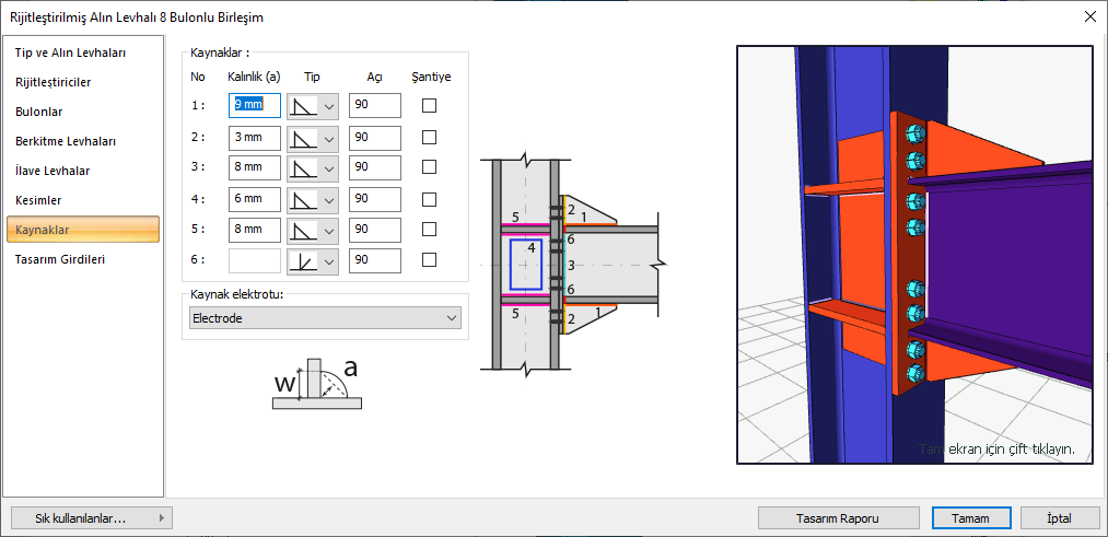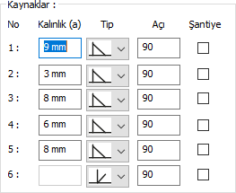 Kaynaklar ![]() Birleşim yerlerine yapılacak kaynakların kalınlık, tip ve açı değerleri verilir. Şantiyede yapılıp yapılmayacağı bilgisi girilir. |