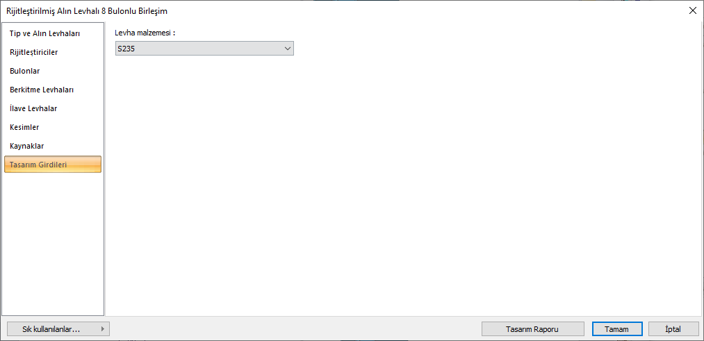Tasarım girdilerinde levha malzemesi tanımlanır.