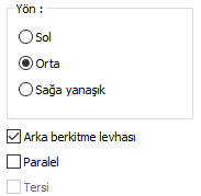 Yön ![]() Berkitmelerin yerleşimi için seçimler yapılır. Arka berkitme levhası işaretlenirse, örneğin I profillerde her iki tarafta da levha oluşturulur. İşaretlenmezse tek tarafta levha oluşturulur. |