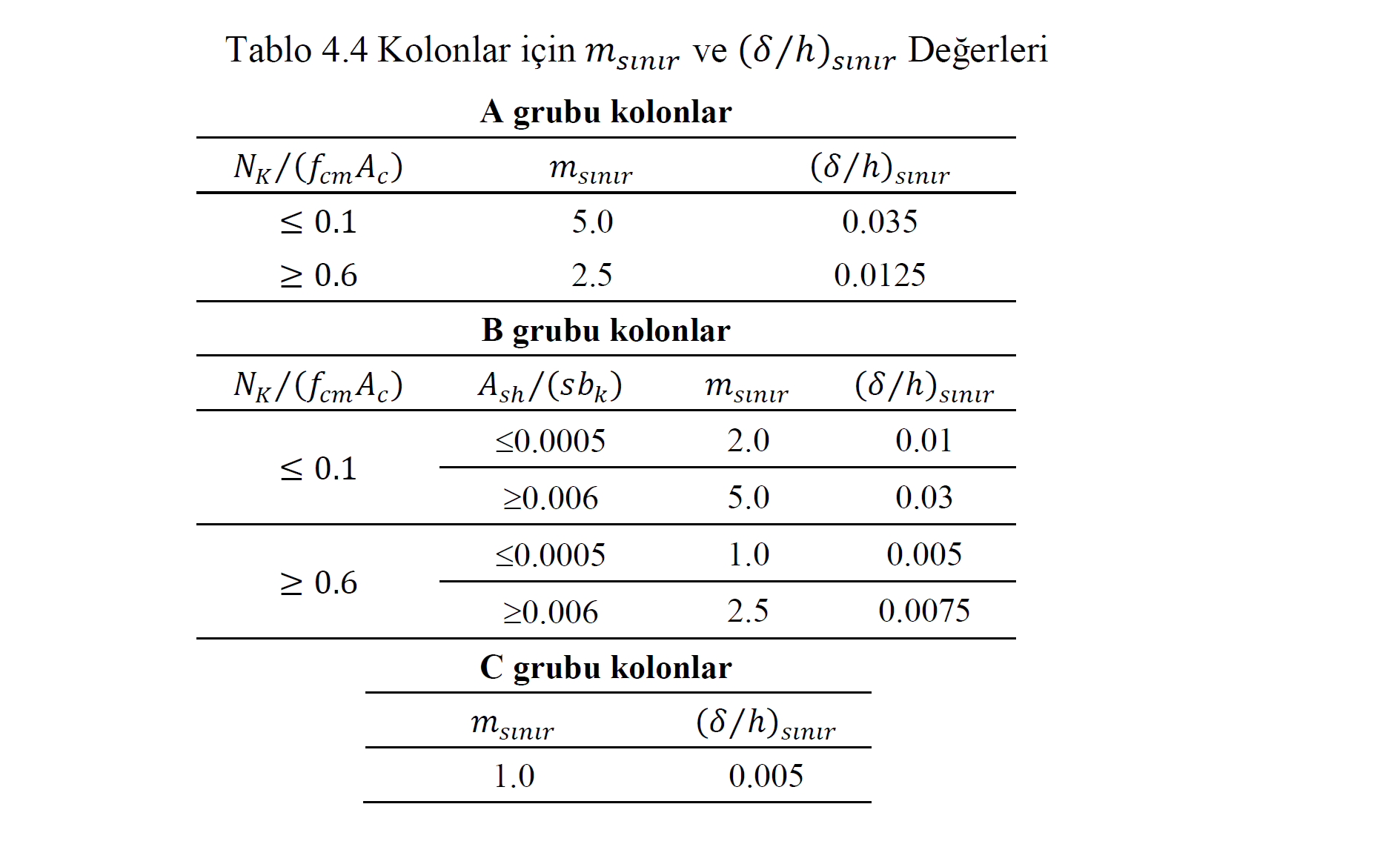 b. İncelenen katlardaki güçlendirilmiş kolonların (betonarme manto, çelik manto, lifli polimer sargı) kat ötelenme oranları (δ/h) ve m değerleri, bu kolonların A ve B grubu olarak belirlenmesi durumunda, sınır değerlerin 0.75 ile çarpılması sonucu elde edilen değerler ile kıyaslanacaktır. C grubu olarak belirlenen güçlendirilmiş kolonların risk sınır değerleri ise Tablo 4.4 ’deki değerler ile aynı alınacaktır.