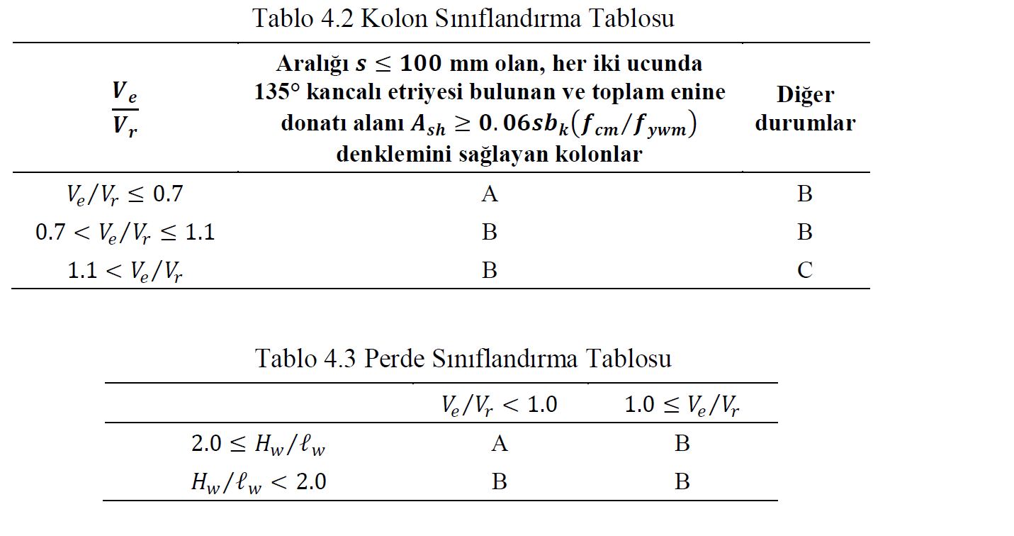 4.3.4 Tüm perdeler (donatı yerleşiminden bağımsız olarak planda uzun kenarının kalınlığına oranı en az 5 olan düşey taşıyıcı sistem elemanları), (Ve / Vr) ve (Hw / lw) oranlarına göre gevrek veya sünek olmak üzere iki gruba ayrılır. Tablo 4.3 ’de nihai durumda A grubu perdelerin eğilme göçmesine ve B grubu perdelerin eğilme-kesme veya kesme göçmesine maruz kalacağı kabul edilir. Mevcut perdelerde veya güçlendirme perdelerinde Ve / Vr oranı EK-E ’ye göre hesaplanacaktır.