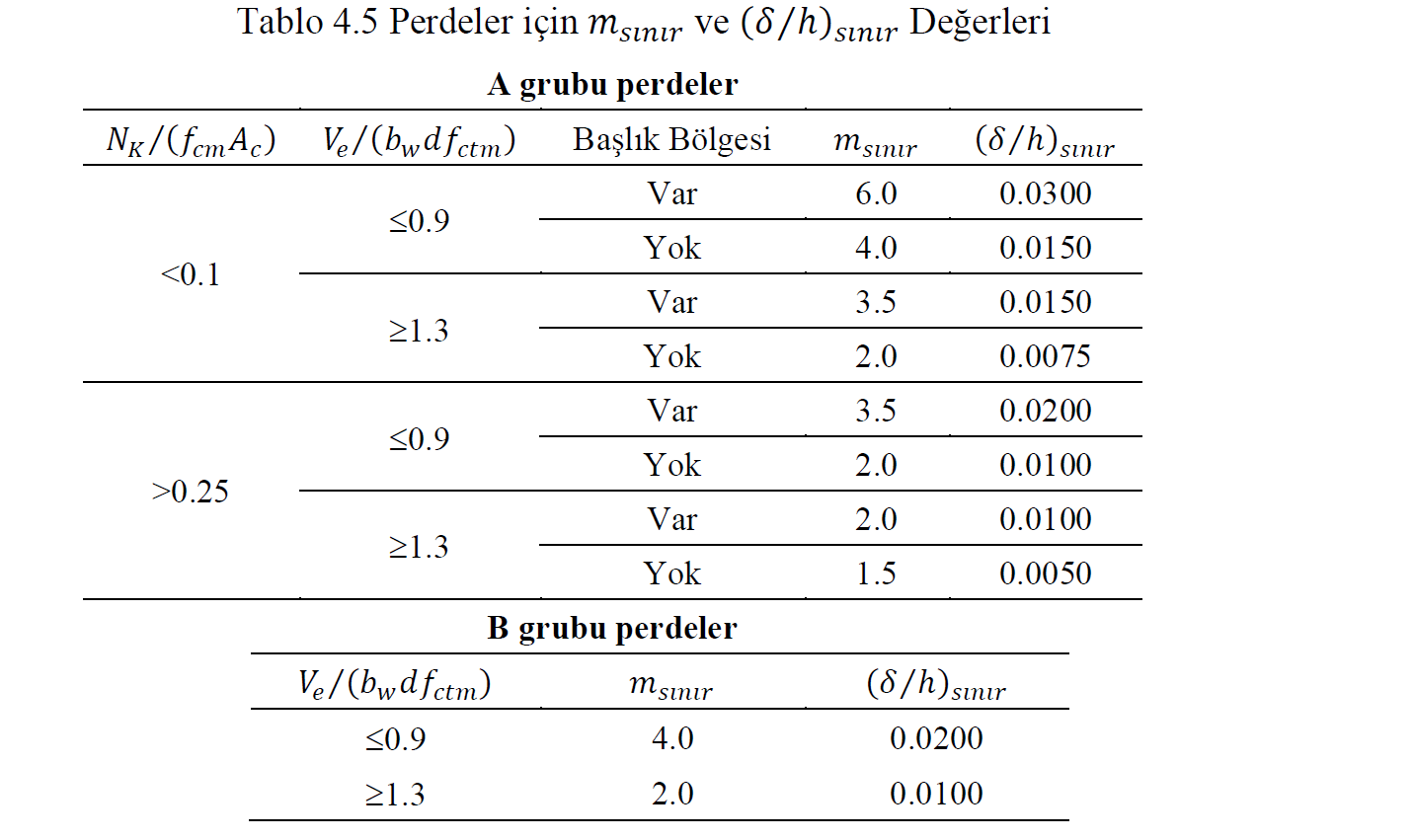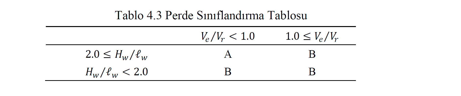 RYTEİE 4.3.4 'e uygun olarak perdeler, (Ve / Vr) ile (Hw / lw) oranlarına göre gevrek veya sünek olmak üzere iki sınıfa gruba ayrılır. Tablo 4.3 'e göre sünek olan perdeler eğilme göçmesine maruz kalır ve A sınıfındadır. Gevrek olan perdeler ise eğilme-kesme veya kesme göçmesine maruz kalır ve B sınıfındadır. Bu sebeple perde sınıflandırması (Ve / Vr) ile (Hw / lw) oranları gözönüne alınarak A veya B grubu olacak şekilde belirlenir.