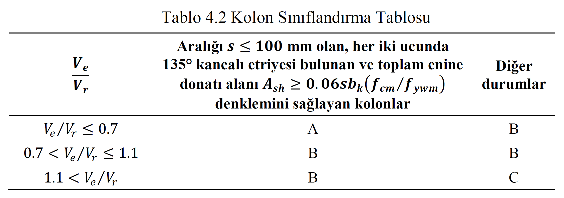 Tablo 4.2 ’ye göre Kolon Sınıfı, (Ve / Vr) oranı ile birlikte kolon sarılma bölgesindeki donatı detayı ve toplam enine donatı alanı kullanılarak A,B veya C grubu olacak şekilde belirlenir.