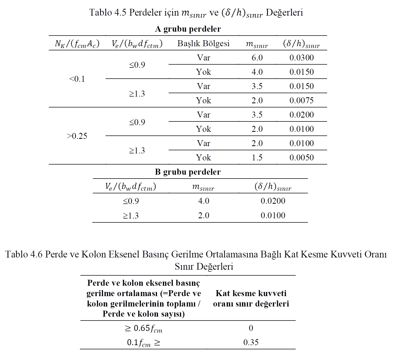 4.4.3 Risk Sınırını aşan perde ve kolonların kesme kuvvetlerinin toplamının kat kesme kuvvetine bölünmesiyle kat kesme kuvveti oranı hesaplanacaktır. 4.4.2 ’de hesaplanan perde ve kolon eksenel gerilmesine bağlı olarak Tablo 4.6 ’da verilen kat kesme kuvveti oranı sınırlarını aşan bina, Riskli Bina olarak kabul edilecektir. Tablodaki ara değerler için doğrusal enterpolasyon uygulanacaktır.