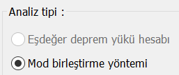 Analiz tipi ![]() Riskli bina analizinde deprem yükünün eşdeğer deprem yükü yöntemine göre mi yoksa mod birleştirme yöntemine göre mi belirleneceği seçilir. Eşdeğer deprem yükü yöntemi, bodrum üzerinde toplam yüksekliği 25 metreyi ve toplam kat adedi sekizi aşamayan, ayrıca ek dışmerkezlik gözönüne alınmaksızın nbi<=1.4 olan binalarda uygulanabilir. Diğer durumlar için Mod birleştirme yöntemi uygulanmalıdır. |