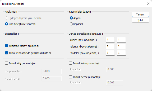Riskli bina analizinde deprem yükünün eşdeğer deprem yükü yöntemine göre mi yoksa mod birleştirme yöntemine göre mi belirleneceği seçilir. Eşdeğer deprem yükü yöntemi, bodrum üzerinde toplam yüksekliği 25 metreyi ve toplam kat adedi sekizi aşamayan, ayrıca ek dışmerkezlik gözönüne alınmaksızın nbi<=1.4 olan binalarda uygulanabilir. Diğer durumlar için Mod birleştirme yöntemi uygulanmalıdır. |