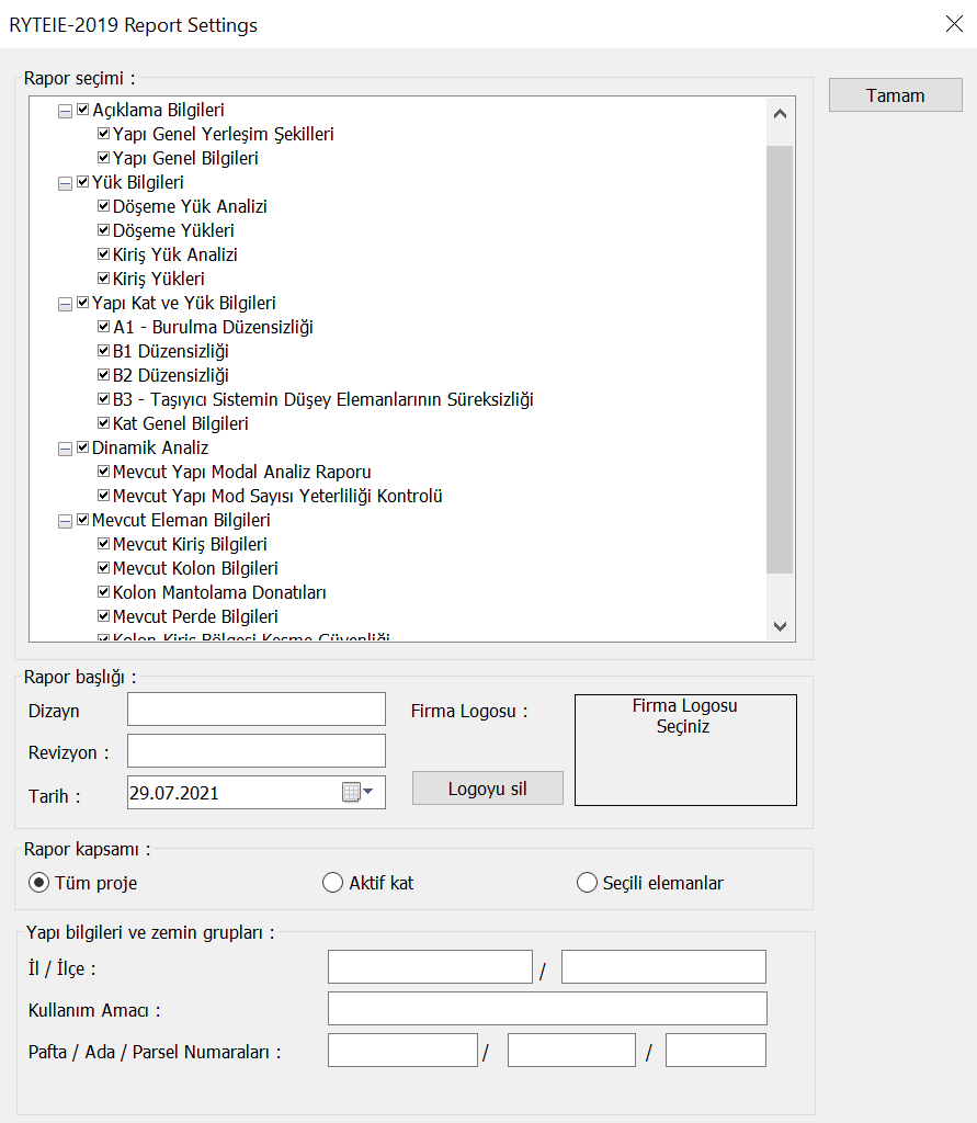 Riskli Bina Analizi komutunu kullandıktan sonra açılan RYTEİE 2019 Rapor Seçenekleri listesinde mevcut eleman bilgileri görülmektedir.