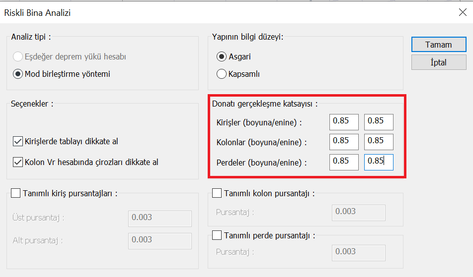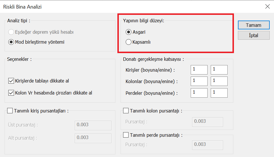 Risk Tespiti hesabında taşıyıcı eleman kapasiteleri (kolon, kiriş veya perde) hesaplanırken girilen mevcut malzeme dayanımı seçilen bilgi düzeyi katsayıları ile çarpılarak hesaplanır. Bu durumda Asgari Bilgi Düzeyi olan bir bina için taşıyıcı eleman kapasitesi daha düşük bir değer hesaplanacaktır. Aşağıdaki resimde Riskli Bina Analizi Ayarları penceresi gösterilmiş ve Yapı Bilgi Düzeyi seçimi kırmızı çerçeve ile işaretlenmiştir.
