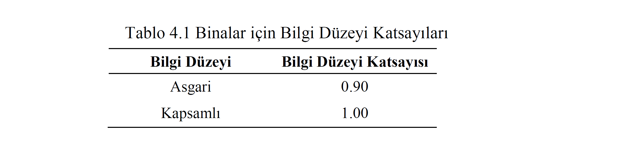 RYTEİE 4.1.4 'e göre binalar için Bilgi Düzeyi Katsayıları Tablo 4.1 'de verilmiştir.