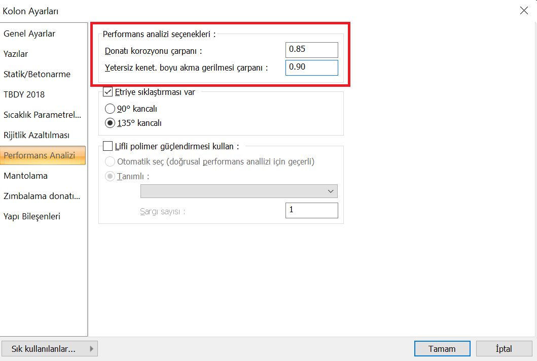 Taşıyıcı eleman kapasiteleri, seçilen Bilgi Düzeyi Katsayısı 'na göre mevcut malzeme dayanımı ile çarpılarak otomatik hesaplanır.