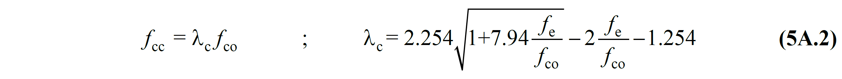 Bu denklemde fe etkili sargılama basıncını ifade eder. Eğer sargı etkisi dikkate alınmaz ise fe değeri sıfır çıkacak ve λc = 1 olacaktır. Bu durumda fcc = fco olacağından Denk.(5A.1) 'deki bağıntı sargısız beton basınç gerilmesi bağıntısı haline gelecektir ve Şekil 5A.1 'de gösterilen sargısız beton grafiği ortaya çıkacaktır.