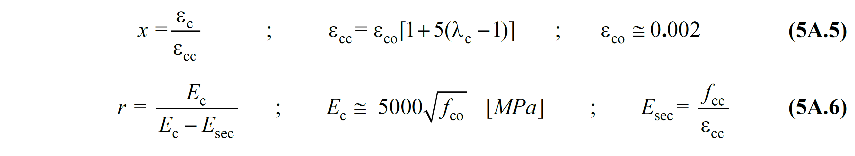 Burada εc beton birim basınç şekildeğiştirmesini ifade eder ve Şekil 5A.1 'de gösterilen grafiğin yatay ekseni anlamına gelmektedir. Bu durumda Şekil 5A.1 'de gösterilen grafik fc ve εc değişkenleri kullanılarak elde edilir. εcc sargılı beton basınç birim şekildeğiştirmesi, εco sargısız beton basınç birim şekildeğiştirmesidır. εcc ve εco arasında Denk.(5A.5) 'de gösterildiği gibi bir ilişki bulunmaktadır. Eğer sargı etkisi dikkate alınmaz ise yukarıda anlatıldığı gibi λc = 1 olacaktır. Bu durumda εcc = εco değerine eşit olur ve sargısız beton için birim şekildeğiştirme bağıntısı bulunur. Eğer sargı etkisi dikkate alınır ise λc>1 olarak bulunur ve bu durumda x bağıntısı sargılı beton için yazılmış olur.