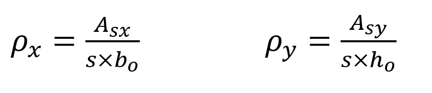 Bu denklemde fyw enine donatı akma dayanımını, ρx ve ρy sırasıyla ( X ) ve ( Y ) doğrultularındaki enine donatıların hacimsel oranıdır ve aşağıda gösterildiği gibi hesaplanmaktadır. Asx ve Asy sırasıyla ( X ) ve ( Y ) doğrultularındaki enine donatı alanlarını, s enine donatı aralığını, bo göbek betonunu sargılayan etriyelerin eksenleri arasında kalan kesit boyutunu göstermektedir.