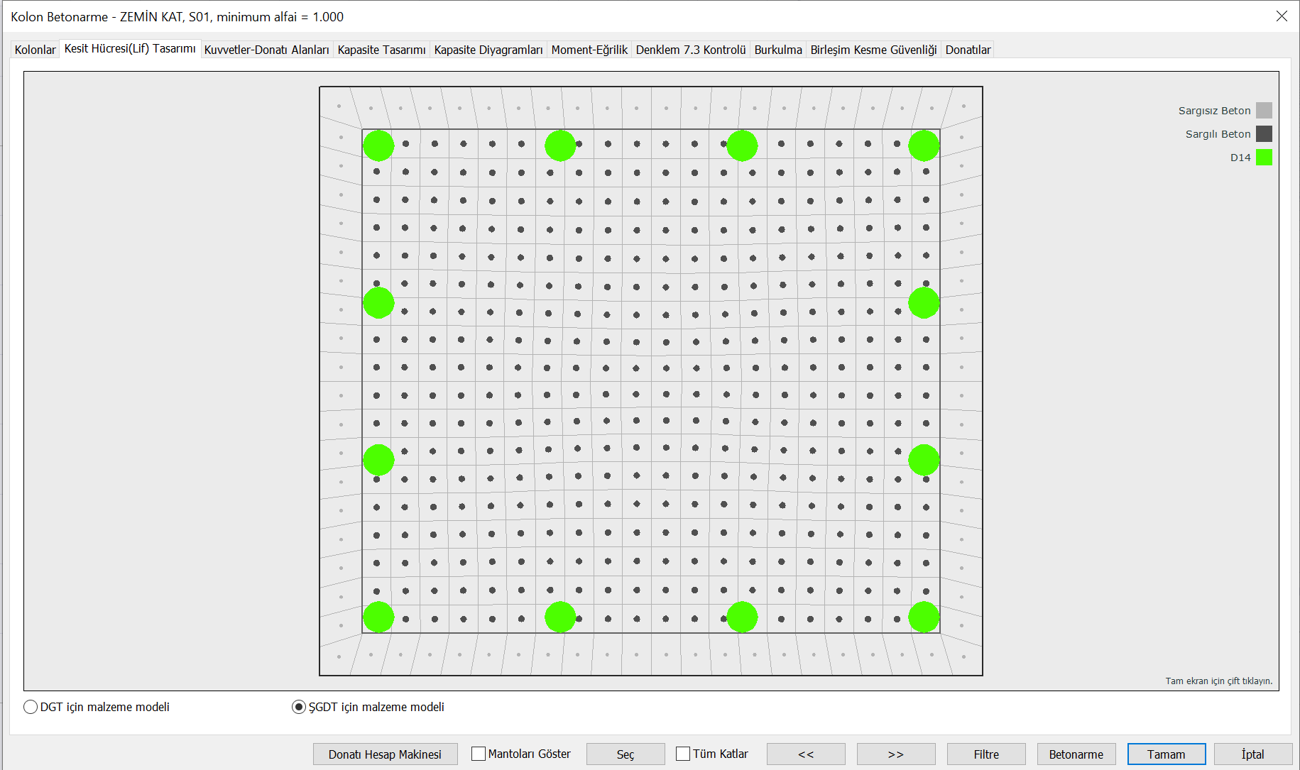 Doğrusal olmayan şekildeğiştirmeler sargılı ve sargısız beton malzeme modeli kullanılacak bölgeler otomatik olarak belirlenir.