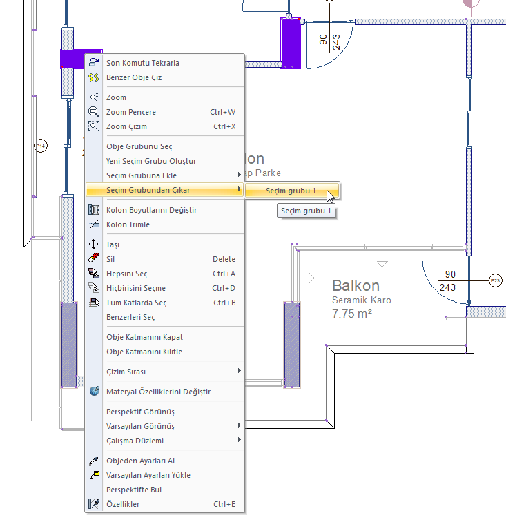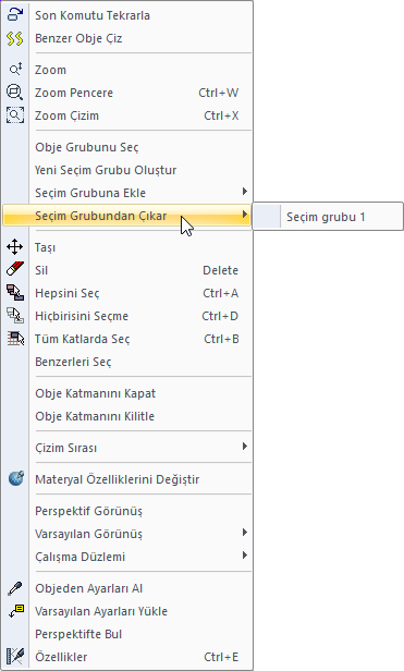Obje seçiminden sonra farenin sağ tuşu tıklandığında açılan menüden Seçim Grubundan Çıkar komutuna ulaşabilirsiniz.