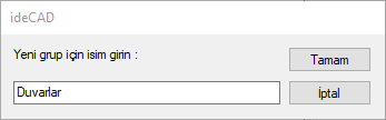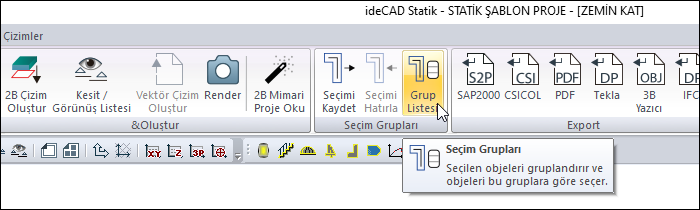 ideCAD'de seçilen elemanları, proje süresince herhangi bir anda tekrar seçmek için Seçim Grupları oluşturulur.