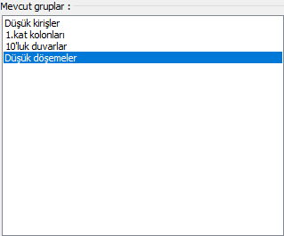 Mevcut gruplar ![]() Projede yer alan seçim grupları listelenir. |