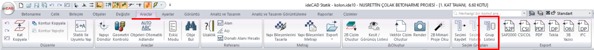 ideCAD’de seçilen elemanları proje süresince herhangi bir anda tekrar seçmek için ”Seçim Grupları” oluşturulur.
