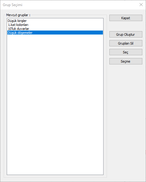 Seç ile listeden seçilen gruba ait elemanları seçebilirsiniz.