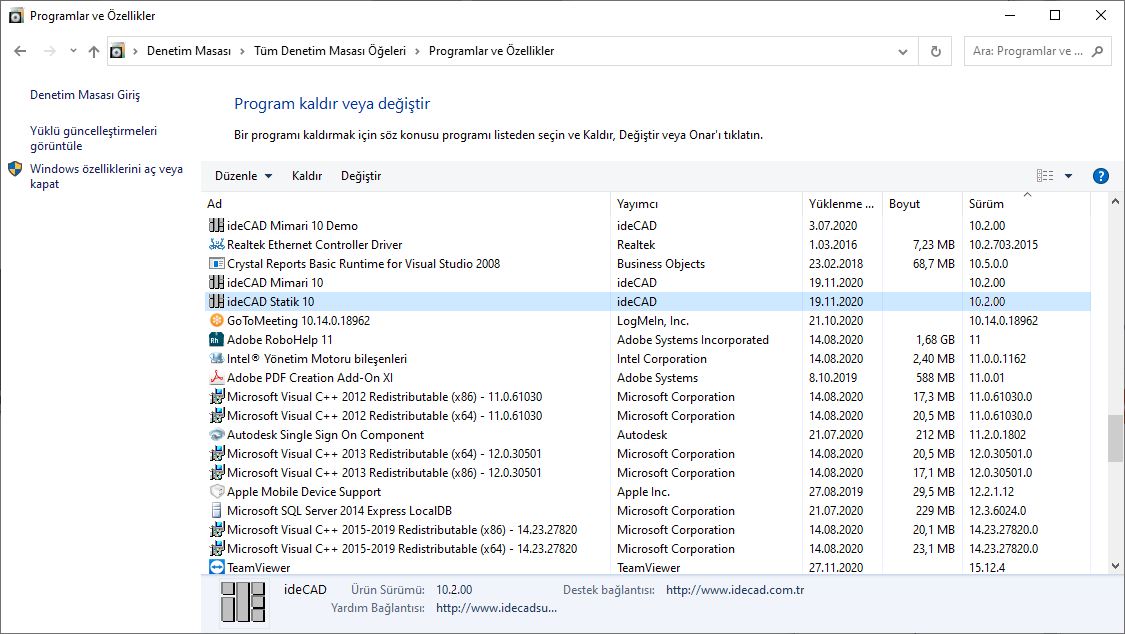 Denetim masasına girin. Programlar ve Özellikleri bölümünden ideCAD Statik 10 programını kaldırınız.